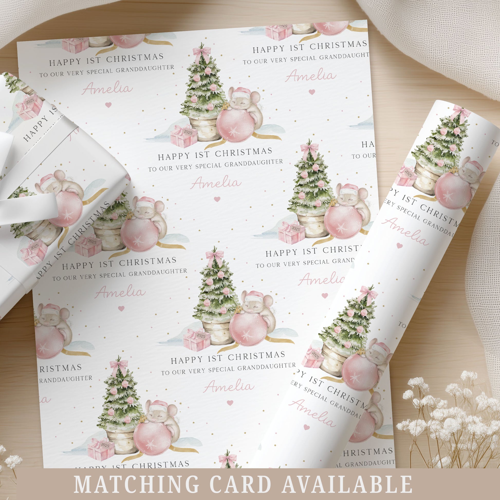 Personalised Girl's Pink First Christmas Mouse Gift Wrapping Paper