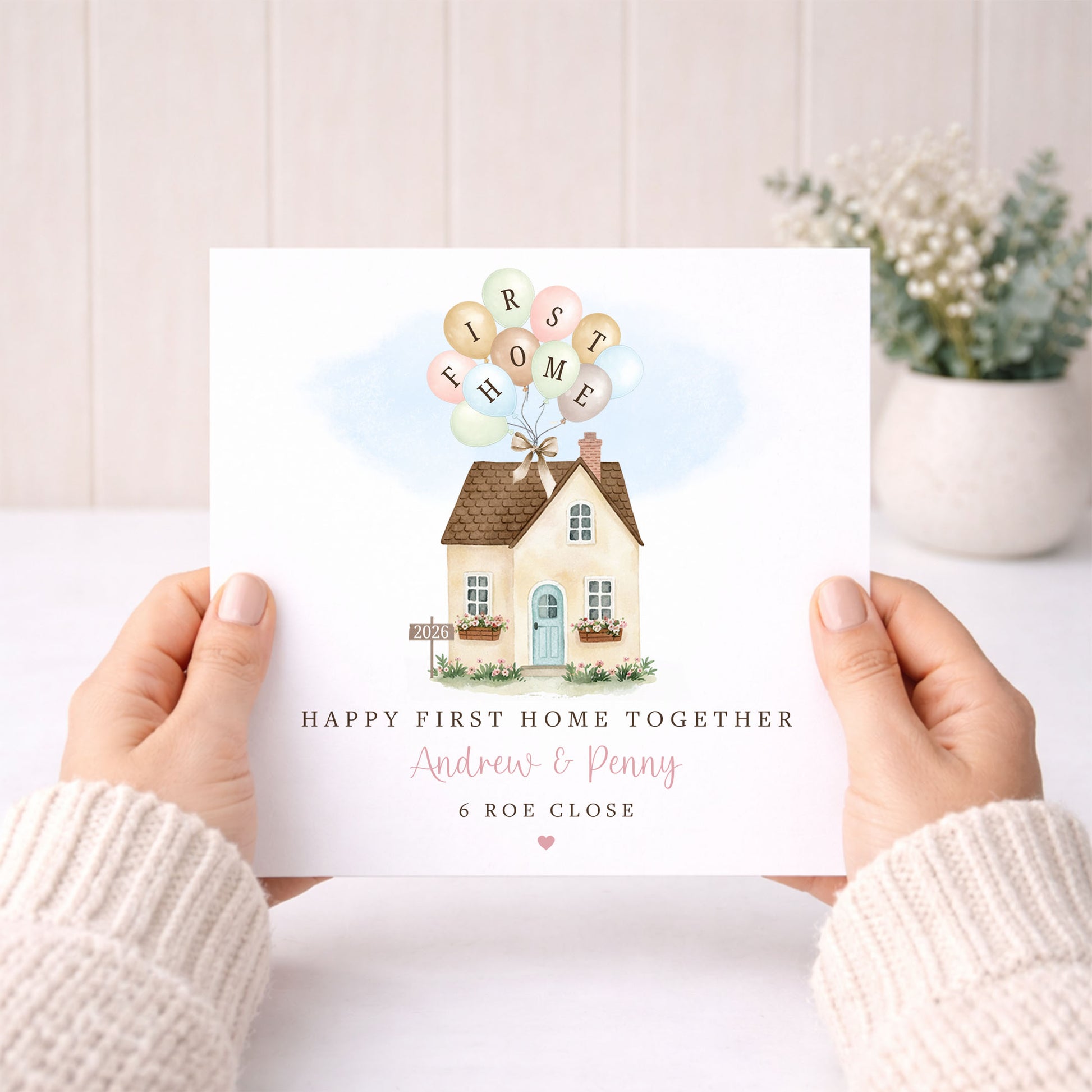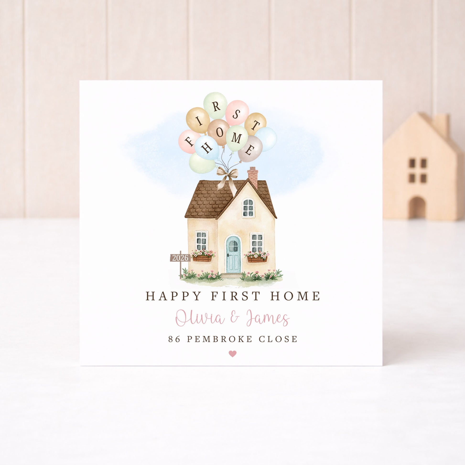 Celebrate a first home milestone with our personalised keepsake card featuring a house with pastel balloons spelling “First Home"